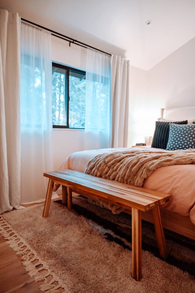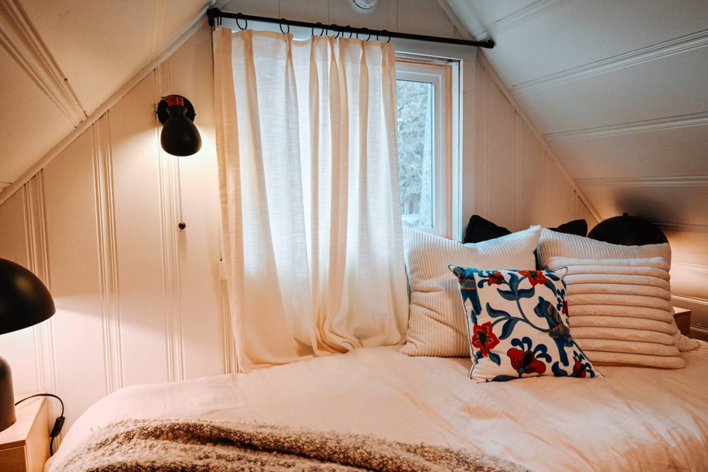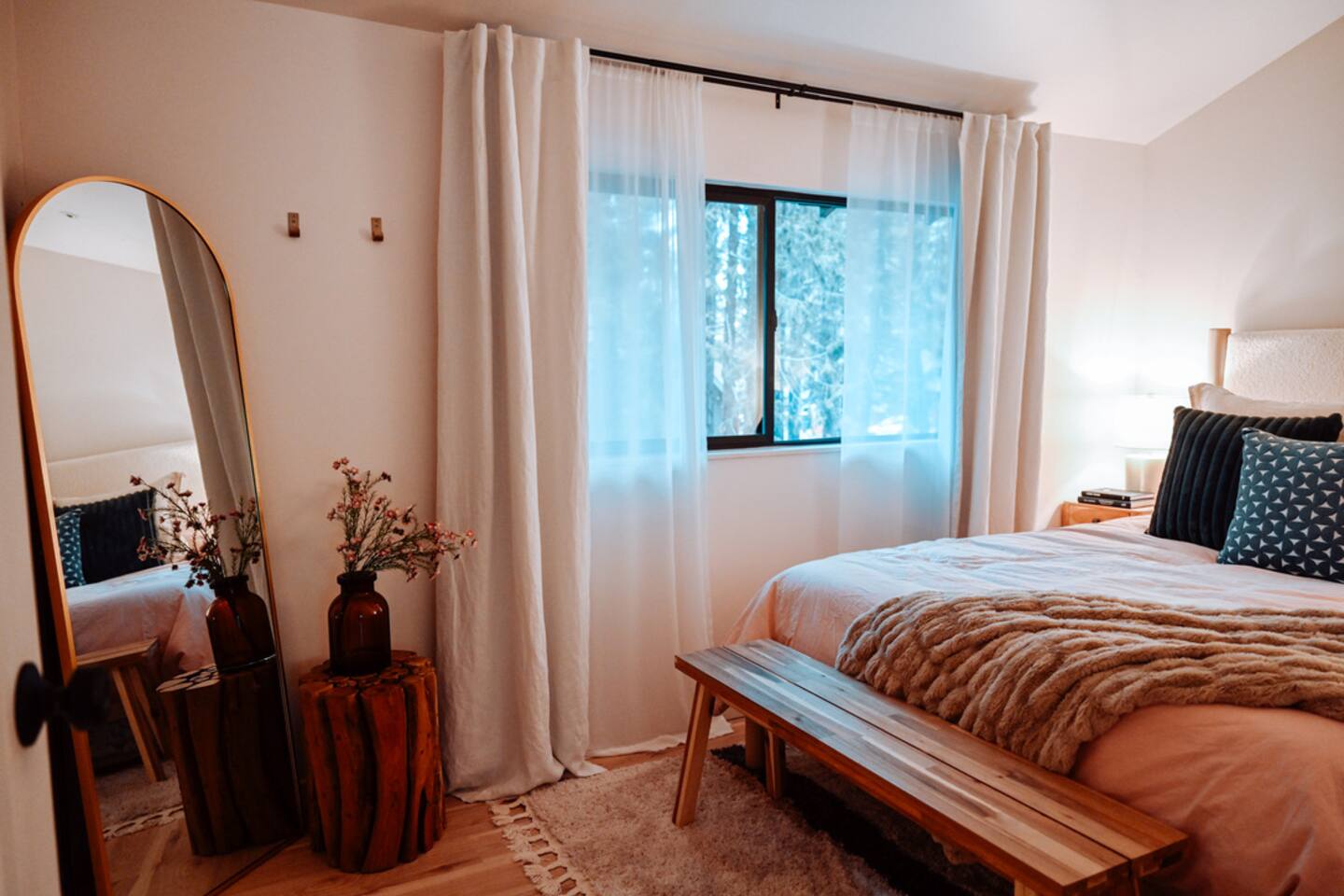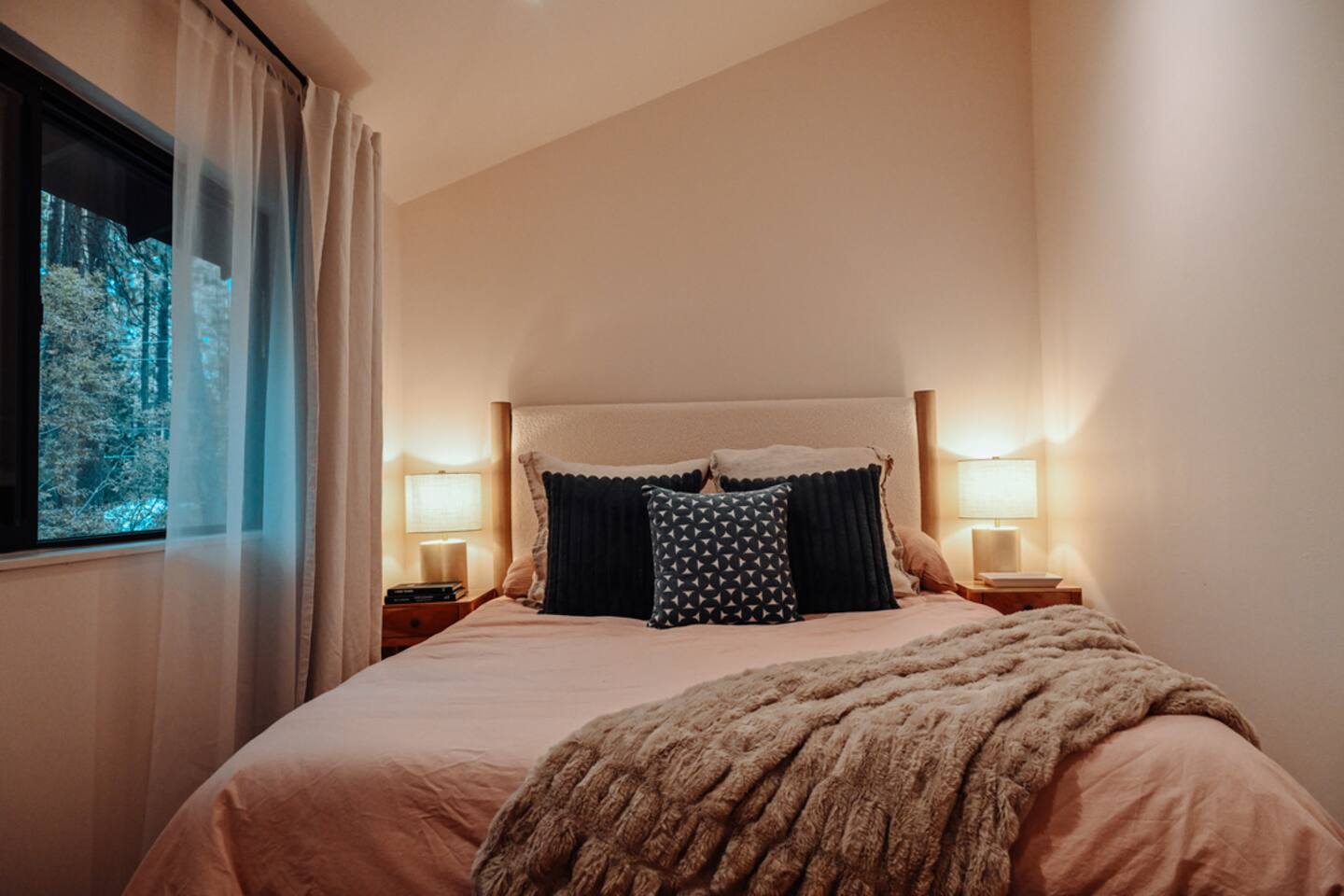 There is one queen bed available on the first floor, and one twin extra long bed available in the loft. Tons of cozy seating in the living room and the front of the house has the BEST forest views!
