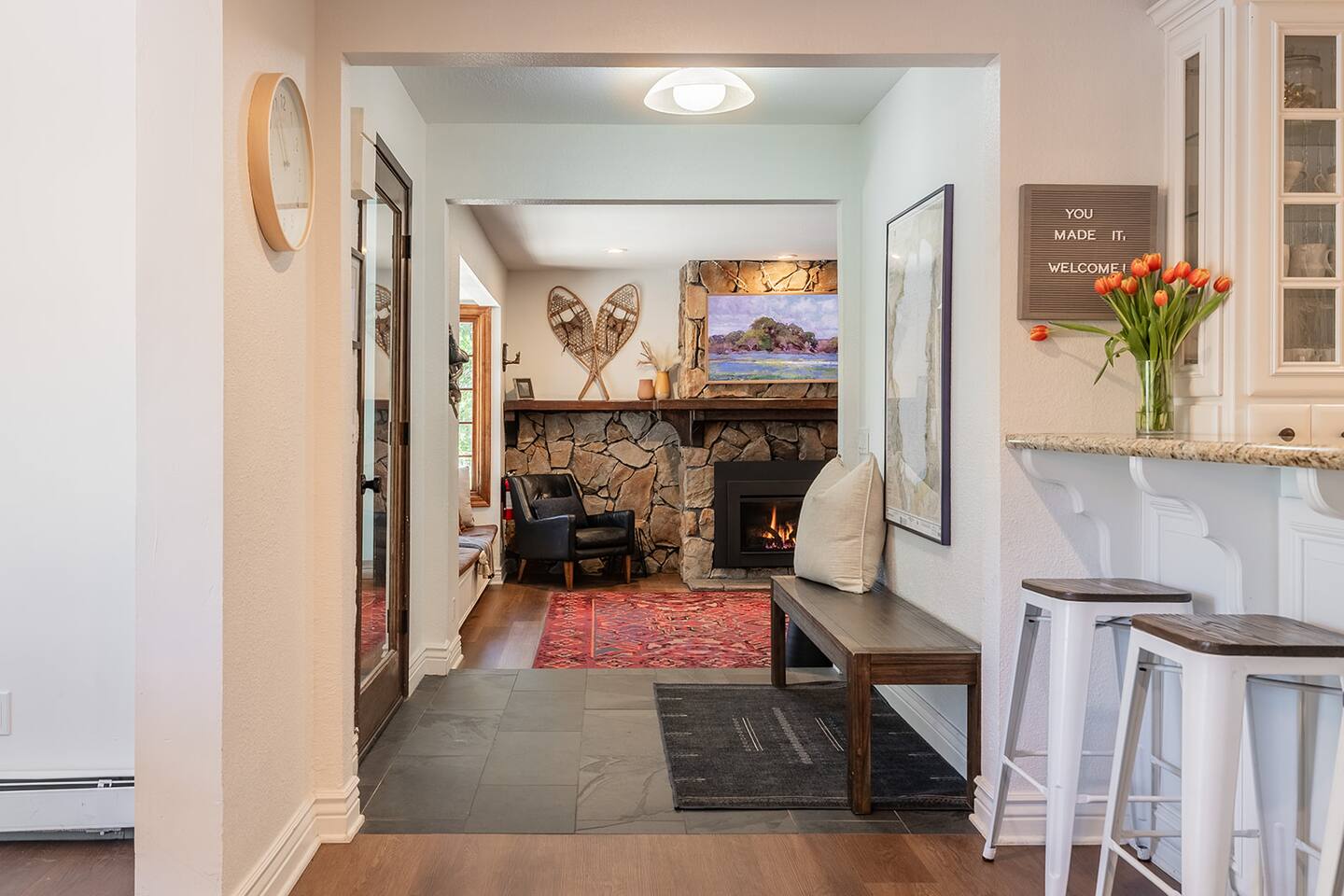 The dining room is just off the kitchen area and next to yet another cozy fireplace. Here you will also find French doors that open up onto the front deck where you can sit around the cozy fire pit or grill something up on the propane BBQ.