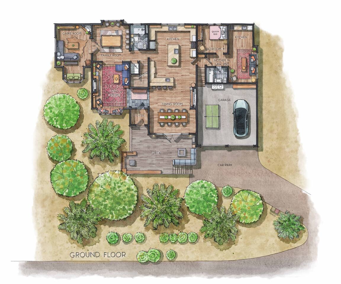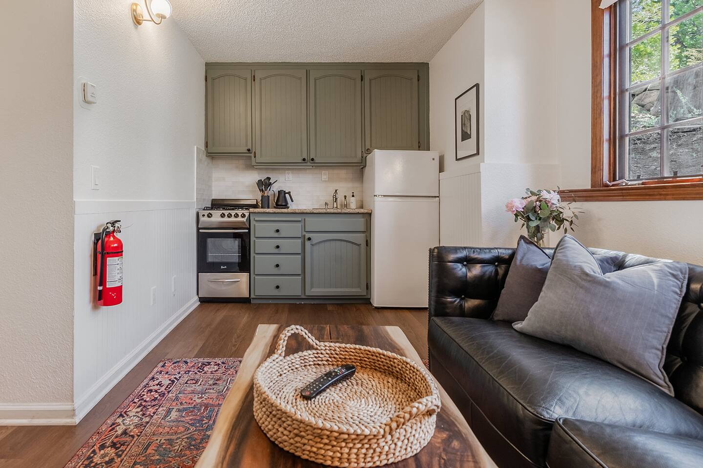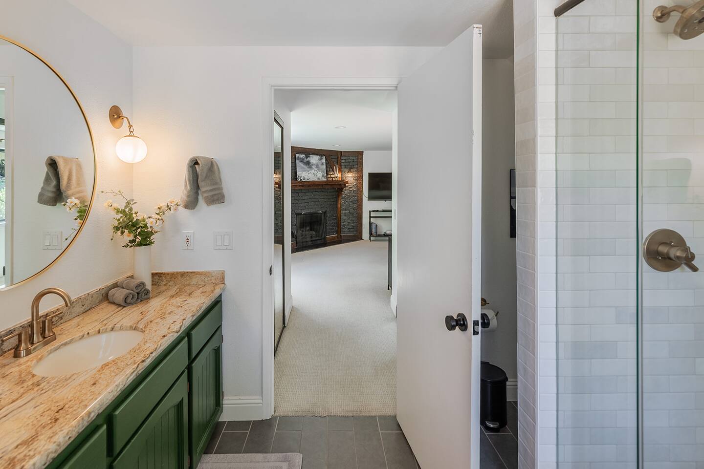 Access to the mother-in-law unit is available through a set of doors just off the kitchen so it's easily accessible but offers a bit more privacy if needed. The mother-in-law unit has a separate bedroom and full bath with a kitchenette and a living room with a flat-screen TV. Separate access to the unit is also available through the garage as well.